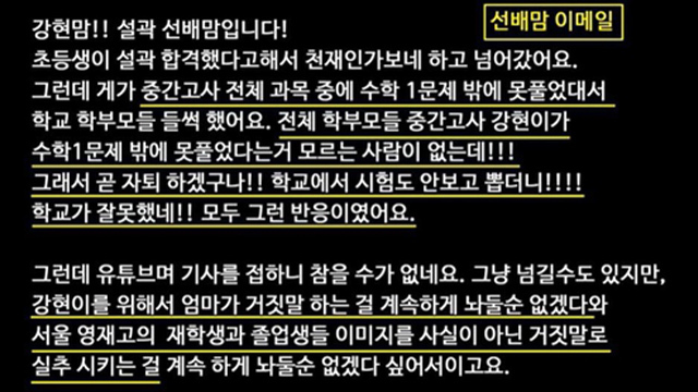 또한, 백 군의 아버지는 같은 학교 재학생의 학부모로부터 받은 '선배 맘'의 메일을 공개하고 정식으로 고발할 의사를 밝히기도 했습니다. 이 메일 작성자는 백 군의 주장이 거짓이며, 실제로는 시험을 보지 않고 학교 수업을 이해하지 못한 것이 자퇴의 진짜 이유라고 주장하고 있습니다.